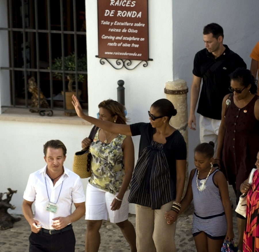 La bicentenaria Plaza de Toros de la Real Maestranza, la Colegiata de Santa María la Mayor, la Casa de Don Bosco o la del Rey Moro son algunos de los monumentos que visitaron hoy la primera dama de Estados Unidos, Michelle Obama, y su hija Sasha, en la que es su cuarta jornada de vacaciones en Andalucía. Y lo han hecho guiadas en todo momento por un rondeño, Antonio Jesús Naranjo.