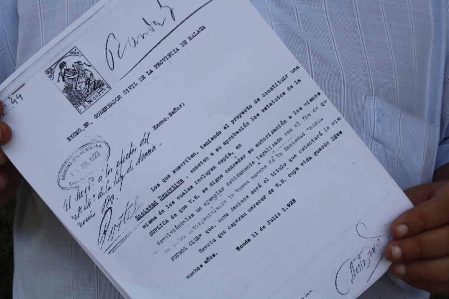 Tanto anteriores directivas del C.D. Ronda como personas relacionadas con el Archivo Municipal de la ciudad, habían buscado sin éxito el documento fundacional. El primer texto del que se tenía constancia hasta la fecha databa de la primavera de 1.926, cuando la directiva del club rondeño solicitaba una subvención en un pleno de la corporación municipal para poder afrontar los gastos de la competición. Manuel Garrido, cronista oficial de la ciudad hasta el pasado mes de junio, fue la persona que dio a conocer este documento, escasos días antes de su dimisión del cargo.