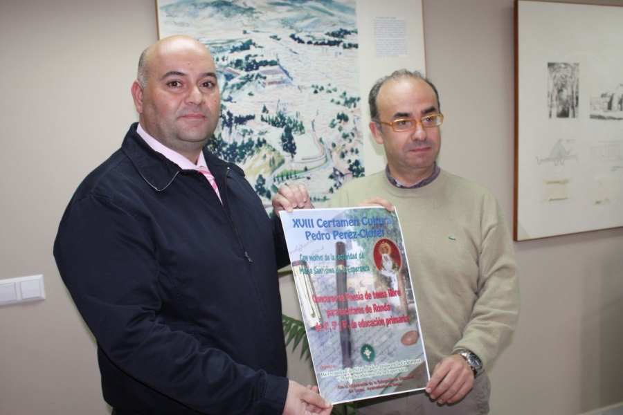 El delegado municipal de Educación, Fernando Corrales, junto con el hermano mayor de la Hermandad de Nuestro Padre Jesús en la Columna y María Santísima de la Esperanza, Alfonso García Galván, ha presentado el XVIII Certamen Cultural Pedro Pérez Clotet (Concurso de Poesía), que ha organizado esta cofradía con la colaboración de esta área del Ayuntamiento rondeño.