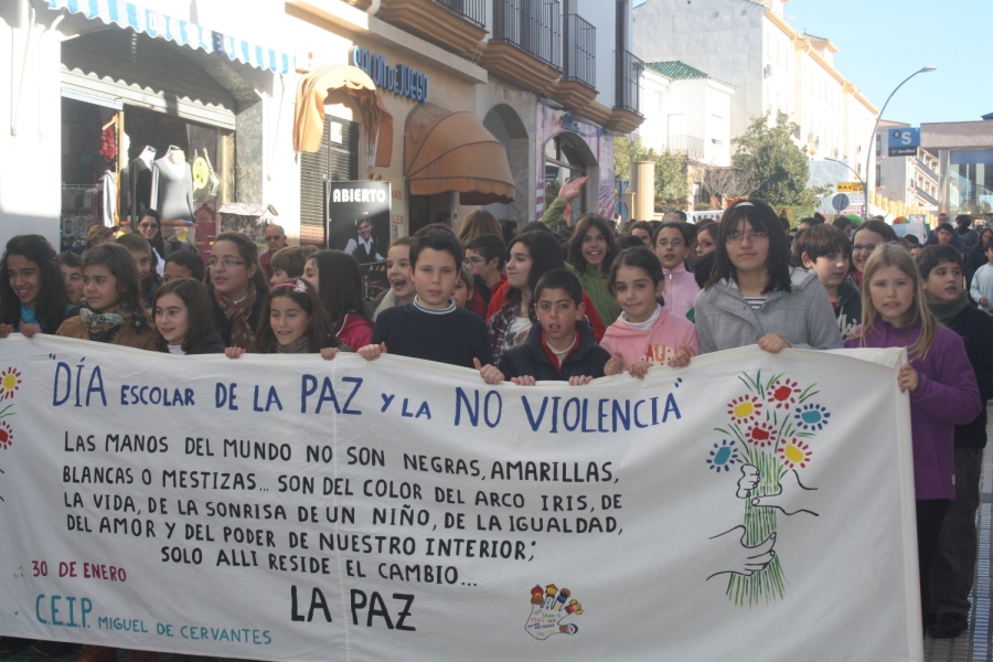 Gran participación de los escolares rondeños en la marcha conmemorativa del Día Internacional de la Paz y la No Violencia, que en la edición de este año ha sido organizada por el colegio La Inmaculada y San José de la Montaña.
