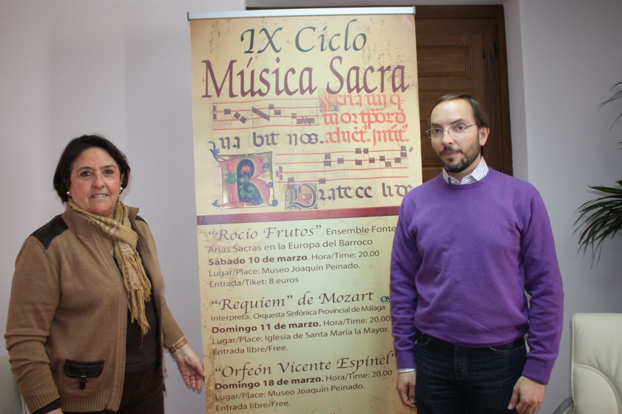 El delegado municipal de Cultura, Daniel Harillo, ha presentado el IX Ciclo de Música Sacra que organiza la Asociación ‘Izna Runda’ y que patrocinan el Ayuntamiento, la entidad bancaria Unicaja y la Diputación Provincial de Málaga. Los conciertos se iniciarán el sábado 10 de marzo con la intervención de Rocío Frutos – Ensemble Fontegara que interpretará arías sacras de la Europa del barroco y que se celebrará en el Museo Joaquín Peinado.