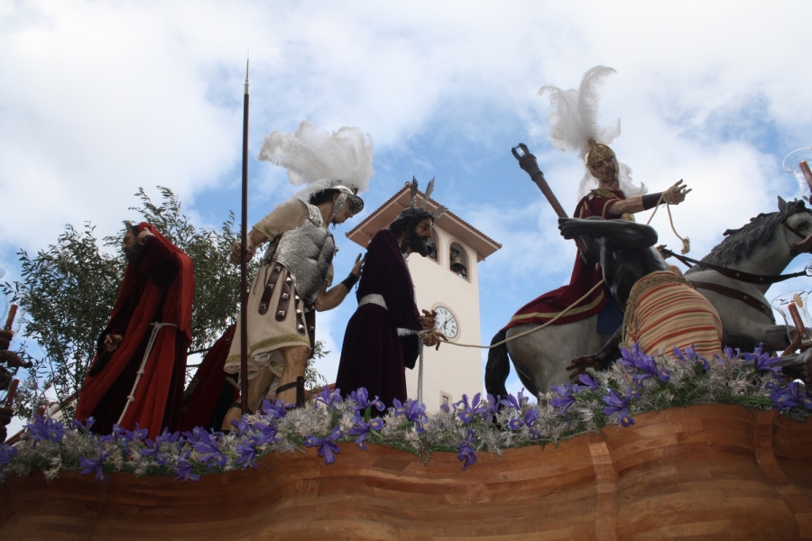 Domingo de Ramos negro en Ronda. La Hermandad de Nuestro Padre Jesús del Prendimiento, María Santísima del Rosario en sus Misterios Dolorosos y San Juan Evangelista efectuaba su salida pocos minutos antes de las seis de la tarde, casi una hora más tarde de lo fijado, después de que la junta de Gobierno estimase oportuno recorrer las calles de la ciudad pese a que los cielos seguían cubiertos y existían probabilidades de lluvia, aunque menores que durante esta mañana, en la que la Hermandad de la Pollinica no pudo iniciar su estación de penitencia desde su sede canónica de San Antonio de Padua, en la barriada de La Dehesa. Desafortunadamente, un chaparrón sorprendió a la hermandad a su paso por la iglesia de Los Descalzos, lo que le hizo acortar su recorrido, propiciando la rápida marcha de los costaleros hacia el Santuario de María Auxiliadora, en la plaza Duquesa de Parcent, lugar de recogida de la hermandad. Pese a ello, las imágenes no han sufrido daños de relevancia, ya que fueron rápidamente tapadas con un plástico de enormes dimensiones.