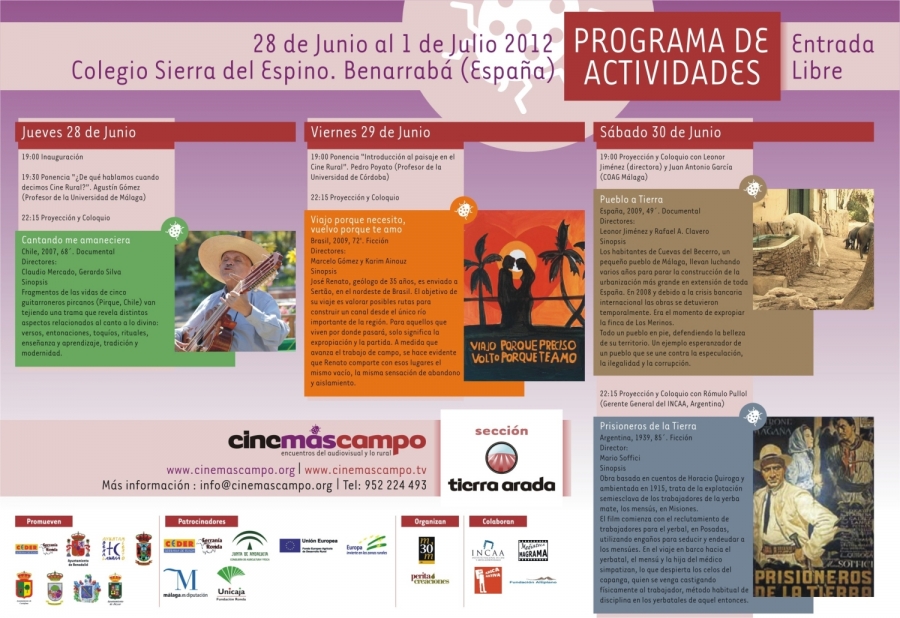 También se proyectará la obra ganadora del Festival Internacional de Cine Rural Arica Nativa 2011, de Chile: Viajo porque necesito, vuelvo porque te amo (Brasil, 20011). El documental chileno Cantando me amaneciera del director Claudio Mercado, y Pueblo a Tierra, una documental local sobre la especulación inmobiliaria en el entorno de Los Merinos (Ronda y Cuevas del Becerro), producido por el Grupo del Genal y dirigo por Leo Jiménez y Rafa Clavero.