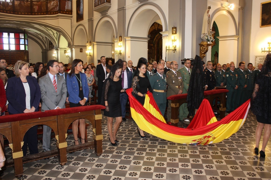 Durante el acto religioso, la regidora, junto con el capitán de la Guardia Civil, Esteban Gómez, colocó una corona a los pies de la imagen de la Virgen del Pilar en homenaje a los fallecidos de este cuerpo.