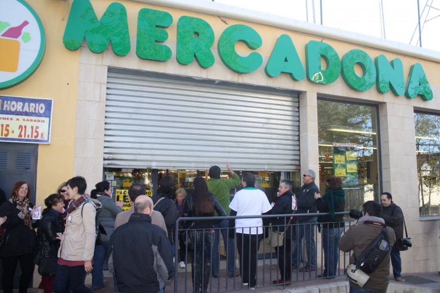 El caminar de los piquetes continuó entonces en dirección al supermercado Mercadona del polígono El Fuerte, que acababa de abrir al público. Tras varios vítores y consignas en favor de la huelga, el establecimiento decidió cerrar sus puertas, ya con los primeros clientes en el interior, que abandonaron el recinto por el aparcamiento acompañados de trabajadores de la empresa. Escasamente quince minutos después efectivos del Cuerpo Nacional de Policía se personaron en el lugar y tras dialogar con el encargado, se restableció la normalidad.