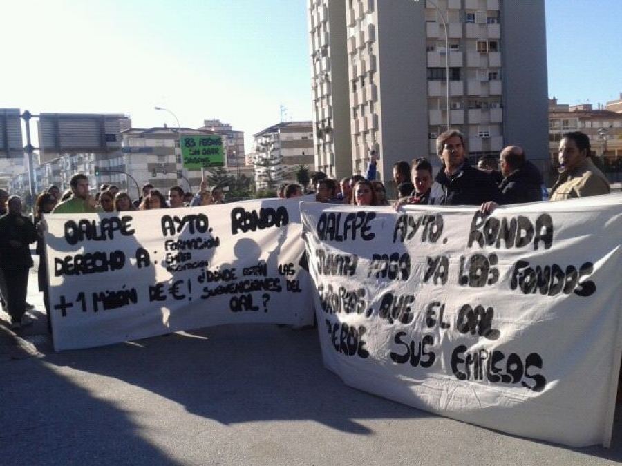 Cerca de 90 alumnos y trabajadores del Organismo Autónomo Local para la Formación y Promoción del Empleo (OALFPE), departamento perteneciente al Ayuntamiento de Ronda, han participado esta mañana en una concentración que se ha celebrado en las puertas de la Delegación Provincial de Empleo de la Junta de Andalucía en Málaga, para solicitar que abone la deuda de 1.5 millones de euros que mantiene el Gobierno autónomo con el Consistorio en concepto de subvenciones atrasadas y justificadas.