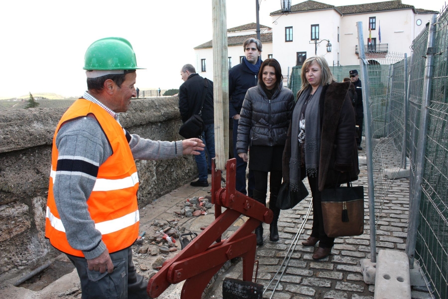 El Ayuntamiento de Ronda ha iniciado esta mañana las obras de reparación de parte de uno de los muros del Puente Nuevo que sufrió una serie de desperfectos y que se localizaron a mediados del pasado mes de noviembre, según ha anunciado la alcaldesa, María de la Paz Fernández, quien estuvo acompañada por la primer teniente de alcalde, Isabel María Barriga, y el edil de Tráfico, Antonio Arenas.