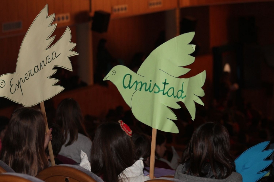 Una representación de alumnos de cada colegio se reunió en la plaza Duquesa de Parcent, portando globos de colores, para emprender el camino hasta el Teatro Municipal Vicente Espinel, donde se realizó un acto que contó con una serie de actuaciones y actividades relacionada con el pacifismo.
