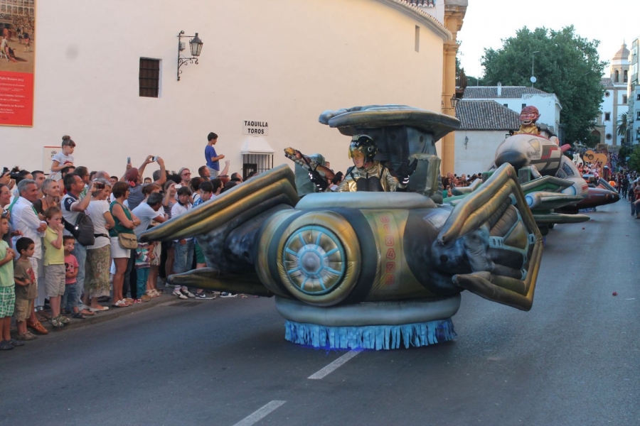 A las 19.30 horas inició su recorrido la cabalgata en la que además de los grupos que han participado en las Galas Folklóricas Internacionales (Italia, Serbia, Eslovaquia, Costa Rica y la Asociación Cultural Abul-Beka de Ronda), también desfilaron diferentes atracciones, pasacalles, numerosos niños y las once Damas Goyescas, acompañadas por su presidenta, Milagros Castaño.