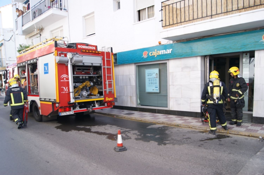 La Policía Local ha tenido que desalojar a los clientes que en ese momento se encontraban realizando sus gestiones en las dependencias de la entidad bancaria y dos dotaciones de efectivos del Consorcio Provincial de Bomberos se han desplazado desde el Parque de Bomberos de Ronda para realizar labores de ventilación.