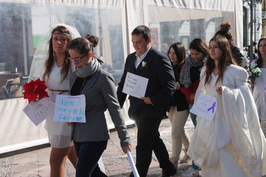 Un centenar de jóvenes del Instituto Pérez de Guzmán se han echado esta mañana a la calle vestidos de novios, como símbolo de rechazo a la violencia machista