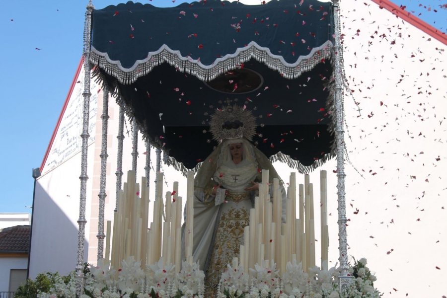 Poco después el crujir de los rosarios sobre el paso de palio anunciaba la llegada de la Titular de la Hermandad, María Santísima del Rosario en sus Misterios Dolorosos, con sorpresa incluida puesto que los bomberos habían preparado una petalada muy especial, que cubrió de flores toda la Plaza del Magistrado Antonio Cantos.