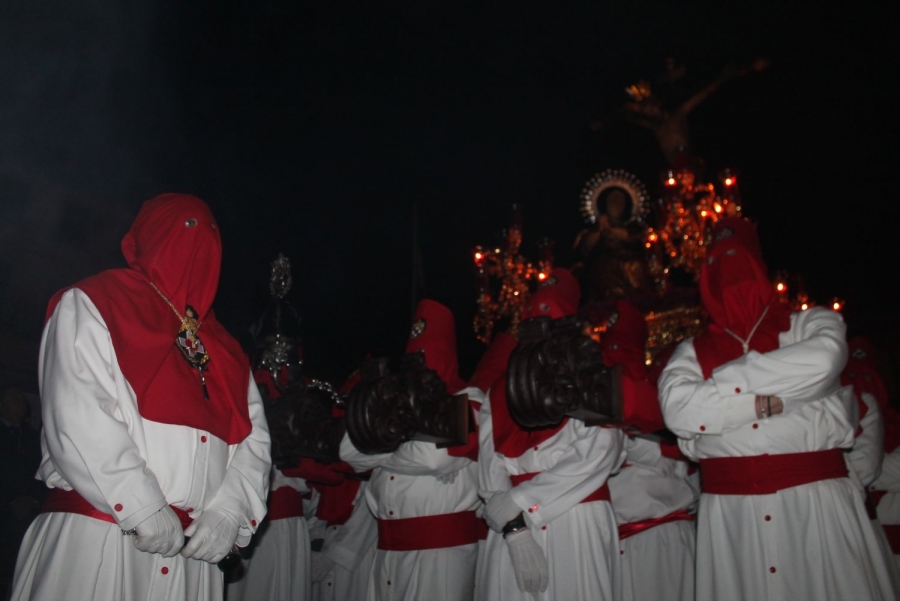 Unos 350 hermanos participan en la estación penitencial con el más absoluto recogimiento, signo característico de la Hermandad del Silencio, que por fin este año ha podido lucir la nueva iluminación del trono después de no poder realizar su estación penitencial por las calles de Ronda en 2013 a consecuencia de la lluvia.