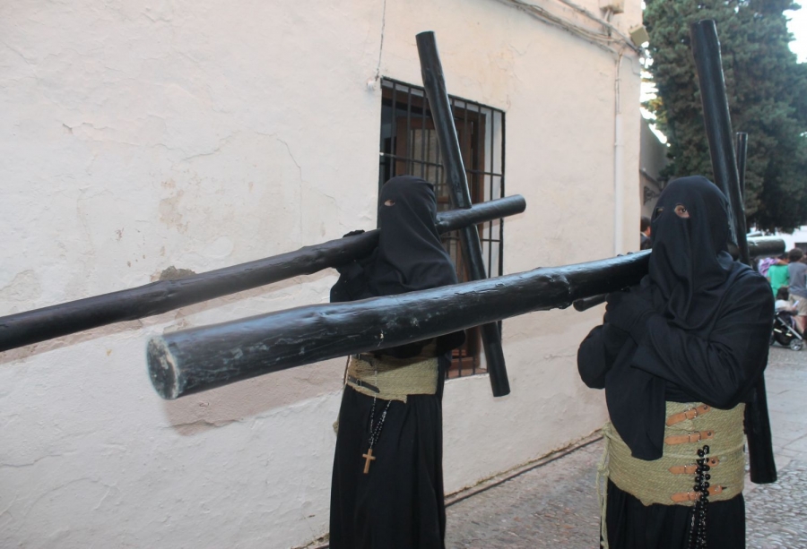 Tradición y recogimiento en el casco histórico en la salida de la Hermandad de Paz y Caridad y de la Vera+Cruz, que ha comenzado su estación penitencial a la hora fijada, las ocho y cuarto de la tarde, desde la Colegiata de Santa María La Mayor.