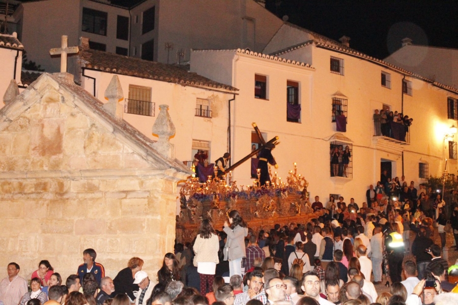 El Señor de Ronda asoma desde el interior del templo, en una salida plástica y bella, pero sobre todo complicada, que los costaleros realizan a las mil maravillas. Constantes vítores al Nazareno, pétalos de flores desde los balcones y un acompañamiento musical de excepción: la Banda de Cornetas y Tambores Nuestra Señora del Rosario, de Arriate. Espectacular la subida hacia el templete de la Virgen de los Dolores de un paso que este año estrena un grupo de arcángeles.