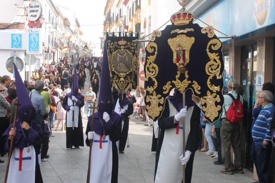 El buen tiempo también ha querido ser testigo del Calvario y ha estado presente en el paso por las calles de la ciudad del Cristo de los Remedios muerto en la Cruz, acompañado por María del Amparo, San Juan y María Magdalena y de esa impactante imagen de la Madre, de íntegro luto, que porta a su hijo entre sus brazos.