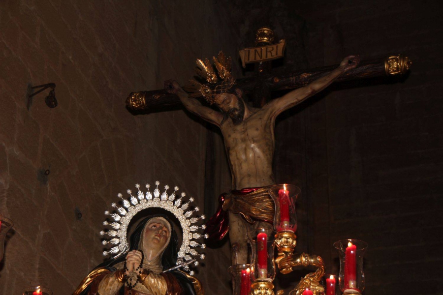 Tres golpes en la entrada de la Colegiata de Santa María la Mayor indican que va a dar comienzo la estación penitencial del Silencio. La ciudad enmudece y las calles se van apagando como símbolo de respeto ante la imponente presencia del Cristo de la Sangre y Nuestra Señora del Mayor Dolor.