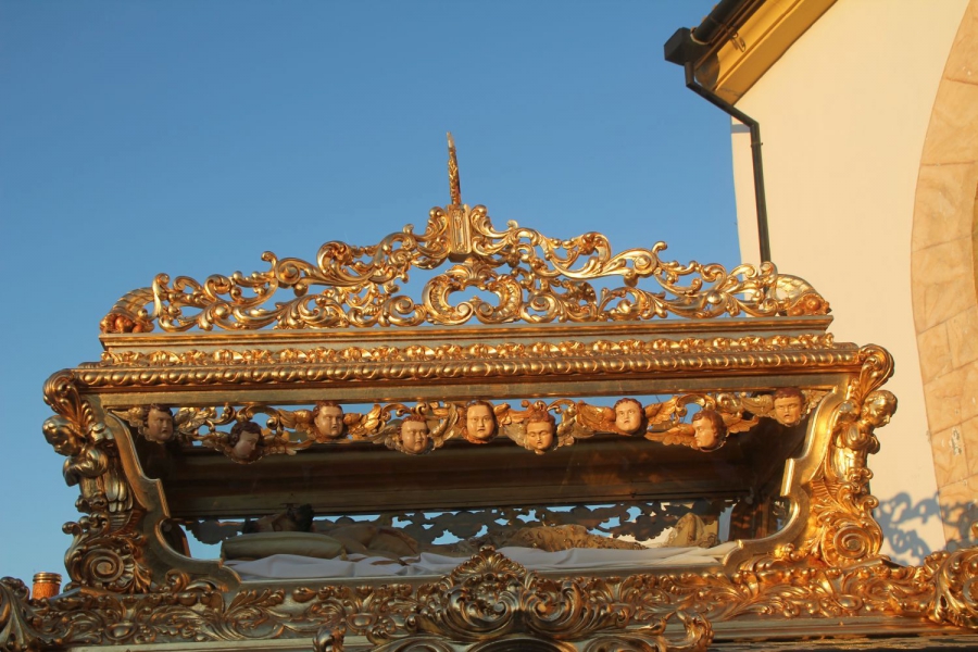 Imponente como de costumbre la urna acristalada sobre la que reposa Cristo Yacente, que destaca por su peso de más de 3.800 kilos y que portaron a hombros los hermanos horquilleros al tiempo que sonaban las marchas de la Agrupación Musical María Santísima del Rosario, de Ayamonte.