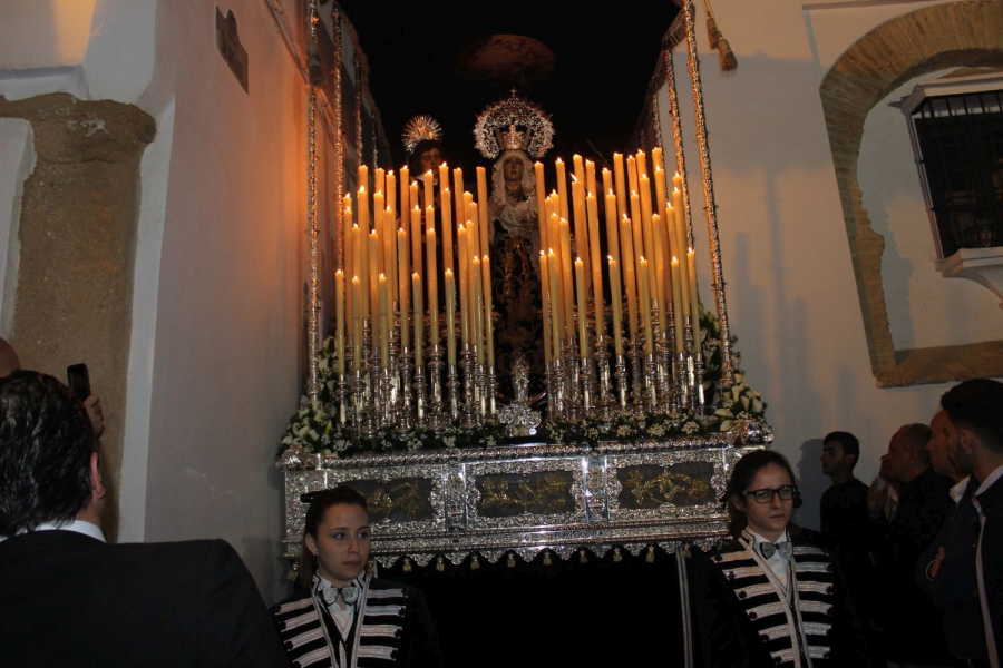 Salida milimétrica y elegancia de la cuadrilla de costaleros a las órdenes de Salvador Carrasco y Diego Tirado, con el acompañamiento musical de un trío de capilla y la Escolanía de voces blancas. Tras ellos, penitentes con el clásico hábito de tergal negro y cinturón de esparto portando cruces sobre sus hombros.