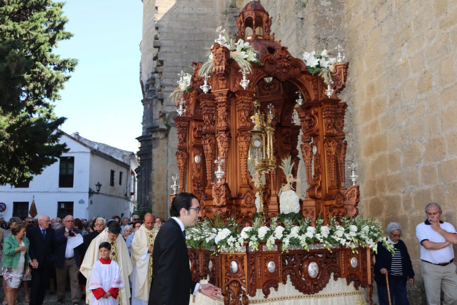 Cientos de personas participaron ayer en la procesión del Corpus Christi tras la Eucaristía en Santa María la Mayor concelebrada por seis sacerdotes y presidida por el arcipreste de Ronda, José Luis Pastor. La misa contó con la participación de representantes de todas las hermandades de Pasión y Gloria de la ciudad y de un coro compuesto por miembros de diferentes parroquias.