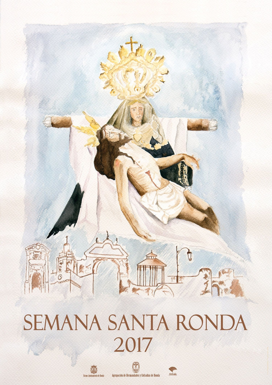 Se trata de una acuarela que muestra a la Titular mariana de la Hermandad de Las Angustias llorando la pérdida de su hijo, una imagen muy característica de la mañana del Viernes Santo. La acompañan monumentos de la ciudad como la plaza de toros de la Real Maestranza de Caballería, la Colegiata de Santa María la Mayor, el Arco de Felipe V, el templete de Blas Infante o las Murallas de la Almocábar.