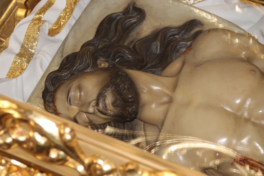 La imponente urna, adornada en sus cuatro esquinas por ángeles, dejaba ver al Cristo Yacente, que se convierte en los pocos de Andalucía que procesiona con la cabeza por delante. Un total de 88 horquilleros se han repartido los 3.800 kilos de peso con los que cuenta la urna acristalada.
