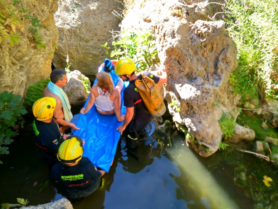 Efectivos del Consorcio Provincial de Bomberos rescataron en la tarde de ayer a una turista portuguesa de 53 años de edad que sufrió una caída desde unos cinco metros de altura mientras se bañaba en el río Guadalevín, en el fondo del Tajo, en una poza próxima al albergue Los Molinos.
