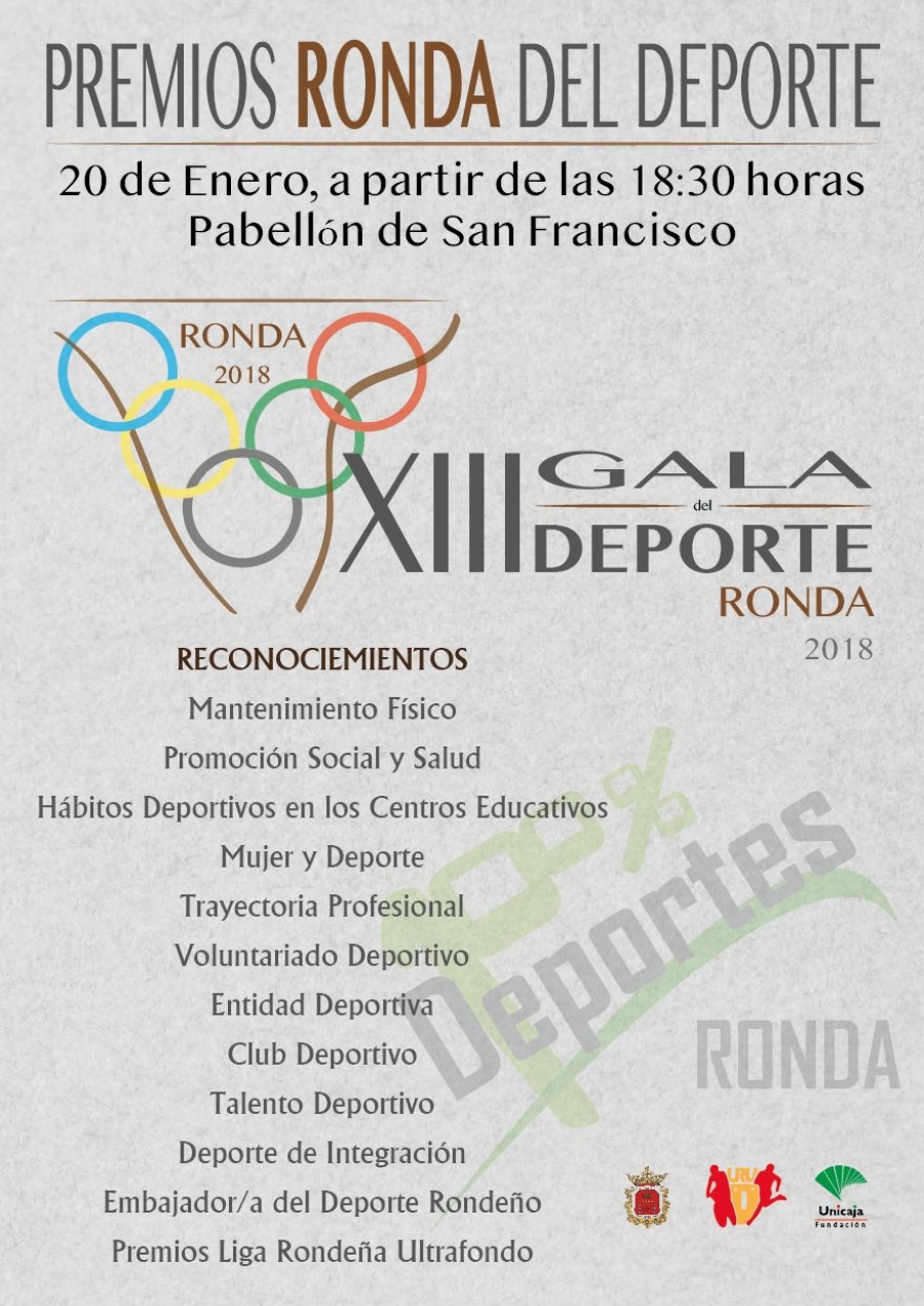 El Área de Deportes del Ayuntamiento de Ronda ha dado a conocer los detalles de la celebración de la XIII Gala del Deporte rondeño que se celebrará el próximo 20 de enero a las 18.30 horas en el Pabellón de Deportes del barrio de San Francisco.