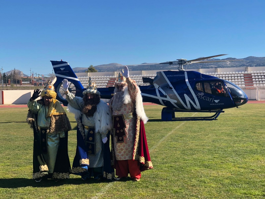 Los Reyes Magos ya se encuentran en Ronda. Pasadas las doce y media del mediodía Melchor, Gaspar y Baltasar, que encarnan este año José Luis Gamarro, David Verdú y Rafael Cañestro, respectivamente, llegaban a la Ciudad Deportiva en helicóptero, en una iniciativa que surgió en 2016 y que se ha repetido por tercer año consecutivo gracias a Ascari.
