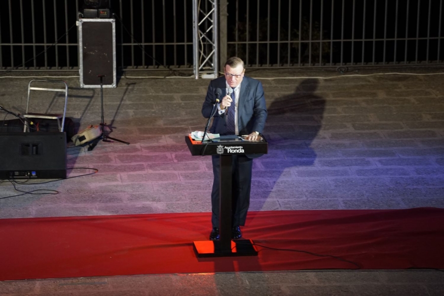 A continuación el periodista de Radio Ronda Juan Miguel Aguilar introdujo al pregonero, que en su intervención mezcló humor y música para ensalzar aspectos de Ronda como su Semana Santa, su Plaza de Toros y su Puente Nuevo, con un texto escrito en verso e intercalado con cantes flamencos.
