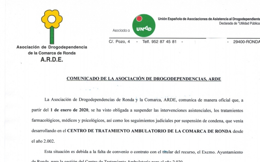 “ARDE seguirá con su actividad como Asociación, y con los programas de prevención, información y promoción de las drogodependencias y otras conductas adictivas, en Ronda y la comarca, no pudiendo ejercer, ni desarrollar, ninguna actividad Asistencial para el Centro de Tratamiento Ambulatorio”, matiza el texto.