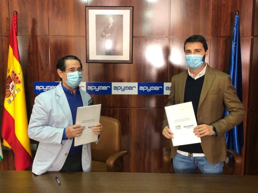 El presidente de Apymer, Francisco Javier Vázquez y Alberto Guerrero, en representación de Comunicaciones Ronda, han firmado un convenio con el que ambas partes pretenden tender la mano a las empresas de la ciudad, conscientes de las dificultades que atraviesan muchas de ellas en estos momentos por la crisis sanitaria provocada por el COVID-19.