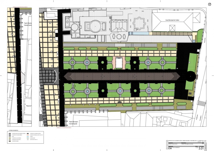 La intervención consiste en la reparación o sustitución de los pavimentos existentes según estado de conservación y la idoneidad de su mantenimiento. Puntualmente se proponen otros trabajos como reparaciones de bancos de madera o luminarias fuera de funcionamiento, así como la adecuación de las entradas existentes y la propuesta de una nueva entrada a eje con el paseo principal.