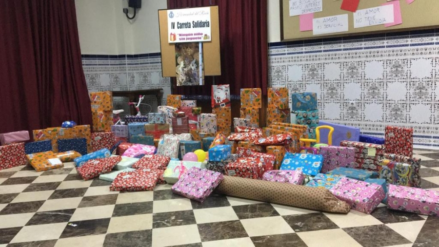 Esta tarde el Hermano Mayor del Rocío, Antonio Martín, ha recibido los más de 20 regalos que los integrantes de la cuadrilla han aportado para la campaña solidaria que la filial de Almonte iniciaba coincidiendo con el periodo de adviento.