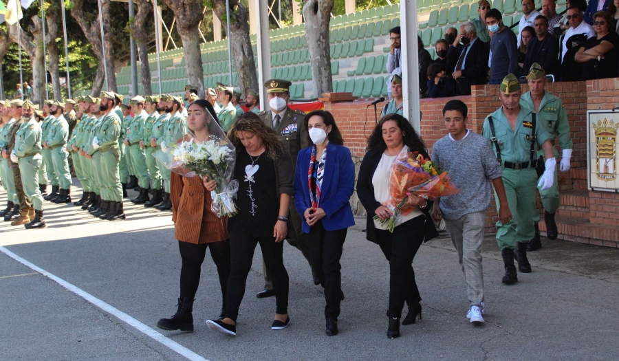 Después de que la fuerza recitase dos espíritus del Credo Legionario y del desfile a pie, la ministra de Defensa y el JEME han acompañado a la madre y el hermano de Pepelu Cañete y a la madre y la pareja de Jordi Oñoro hasta el monumento, a los pies del Cristo de la Buena Muerte, donde han depositado dos ramos de flores.