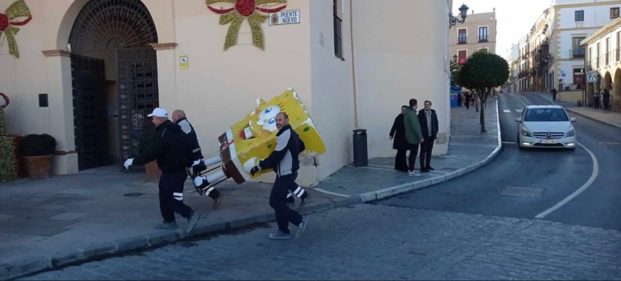 Esta mañana, operarios de la empresa SOLIARSA han recogido la figura de la popular serie infantil realizando trabajos verticales por las cornisas, a la altura del Puente Nuevo. La delegada de Fiestas, Concha Muñoz, ha afirmado que la imagen ha quedado muy deteriorada y que, aunque el buzón seguirá contando con la presencia de Calamardo y Patricio, Bob Esponja no podrá volver a exhibirse en las calles rondeñas esta Navidad.