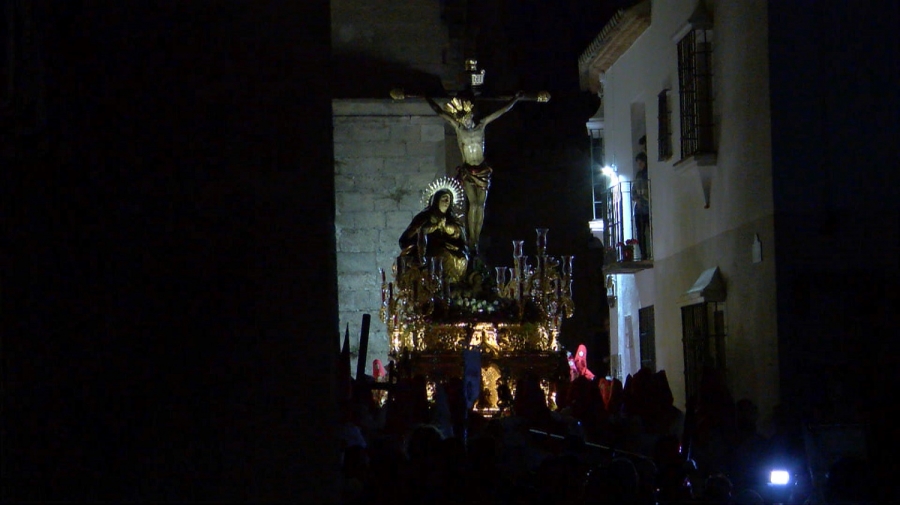 El silencio se rompió con el rezo melódico a cargo de la escola gregoriana Grupo Fernando de las Infantas, procedente de Córdoba. El trono de la Hermandad Sacramental del Santísimo Cristo de la Sangre y Nuestra Señora del Mayor Dolor lució rosas de color púrpura, alelíes cardenal, rosas blancas y bracicas blancas.
