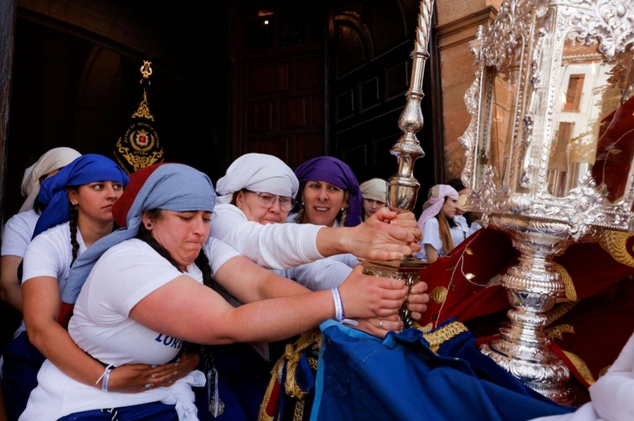 Así, Jon Nazca, que trabaja en la actualidad para la agencia internacional Reuters, ocupa los puestos: número 2, con las costaleras de la Virgen de Loreto, este Domingo de Resurrección, agarrando el palio en la salida desde la Iglesia del Espíritu Santo, para posibilitar la complicada maniobra; número 20, con una fotografía de mujeres vestidas de mantilla, en el Huerto; y 25, igualmente con mujeres de mantilla como protagonistas.