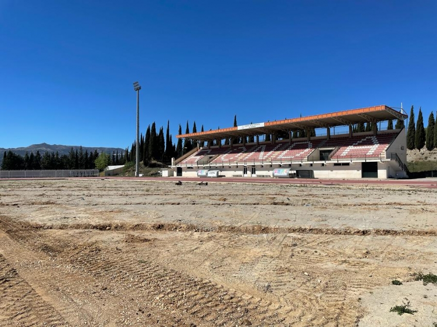 El Ayuntamiento de Ronda ha reiniciado los trabajos de sustitución del césped natural por artificial, del campo de fútbol de la Ciudad Deportiva, una actuación que se quedó al 20 por ciento de su ejecución, aproximadamente, después de que la empresa adjudicataria tuviese problemas económicos.