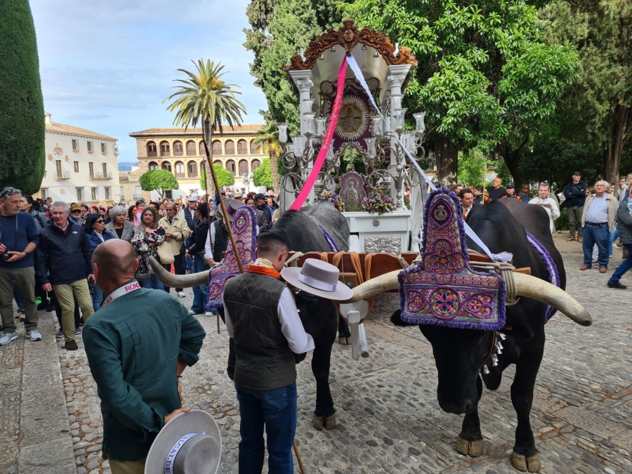 La nueva ha sido realizada en Córdoba, en La Rambla, en el taller de carpintería religiosa de Manuel Torres. En la salida, Martín agradeció la ayuda de todas las personas que han hecho posible este proyecto y depositó en la carreta un pergamino con todos sus nombres. La alcaldesa de Ronda, María de la Paz Fernández, acompañó a la Hermandad en la salid, al igual que, entre otros, representantes de la Hermandad de la Virgen de la Cabeza de nuestra ciudad.