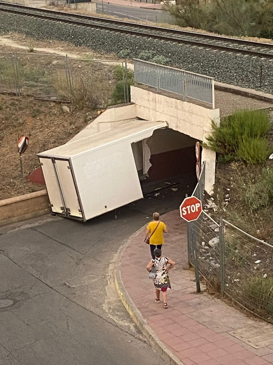 Curiosamente, ese mismo día, otro camión quedó atrapado en el paso bajo las vías del tren en el Llano de la Cruz, que en este caso, más que por su altura, destaca por su estrechez.