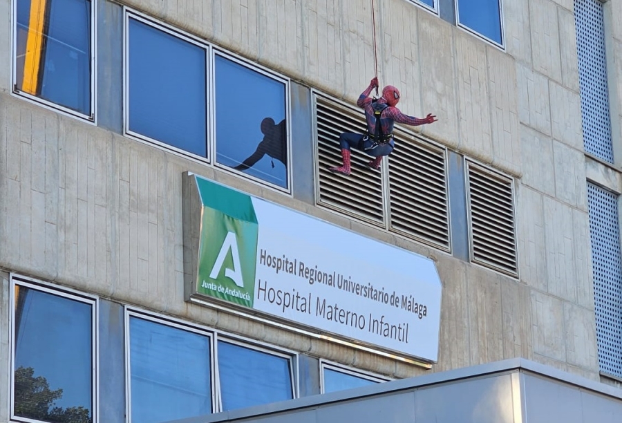 El Hombre Araña se descolgó de la séptima planta del Hospital Materno Infantil de Málaga para felicitar y enviar su ánimo y apoyo a todos los pacientes ingresados en la cuarta planta del centro hospitalario.