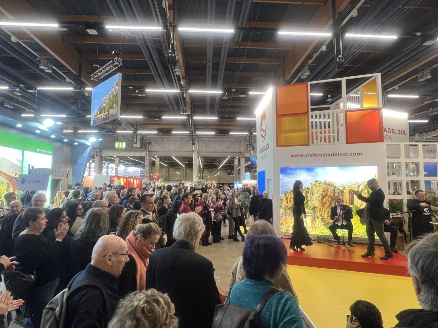 Actuación flamenca en el stand de Turismo y Planificación Costa del Sol, con la imagen del Puente Nuevo