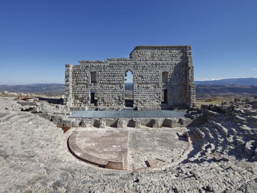 Destaca por su impresionante teatro, construido posiblemente a mitad del s. I a.C. uno de los más antiguos y singulares de la antigua Hispania romana. Con un diámetro aproximado de 62 metros presenta el graderío (cavea), excavado en la roca caliza del lugar y ofrece un frente de escena construido con sillares, hoy desnudos, pero que su día albergaba elementos decorativos como esculturas, columnas, mármoles, inscripciones, altares que fueron expoliados tras su abandono.