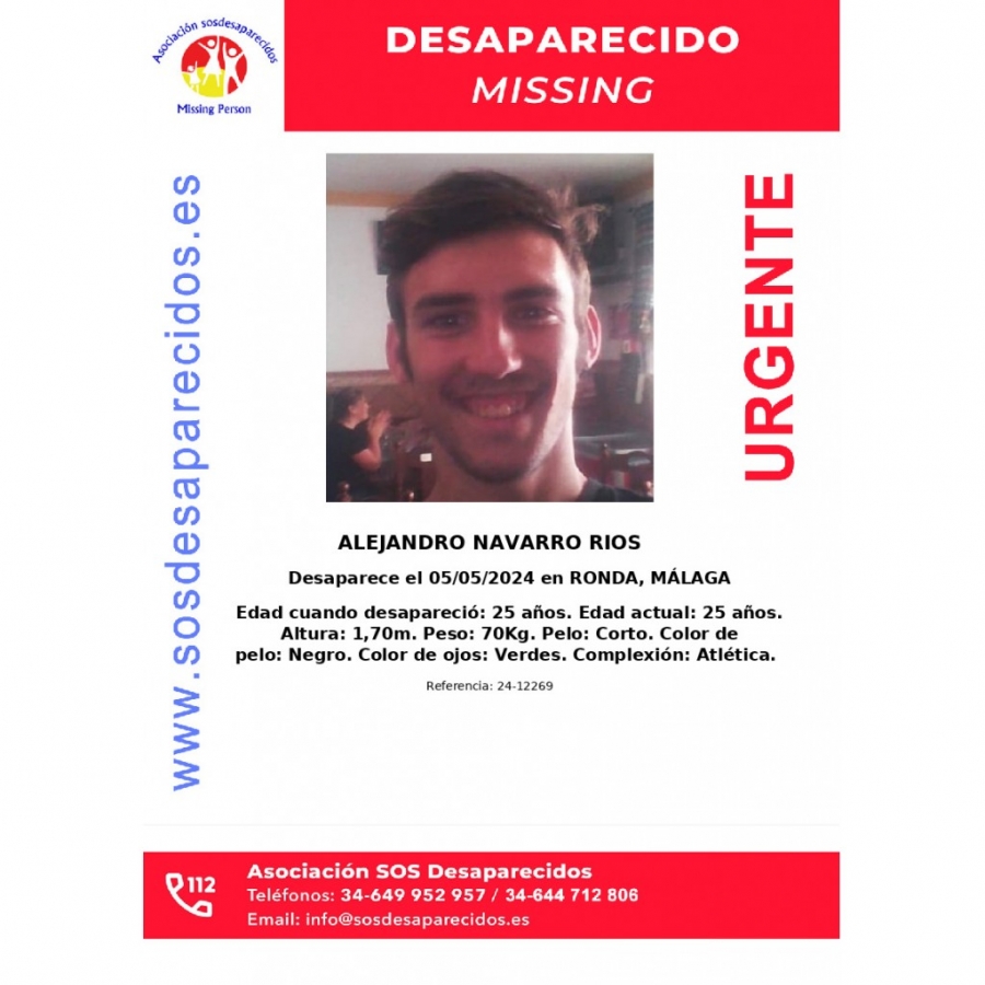 Pasan los días, y ya son 24, sin noticias de Alejandro Navarro Ríos. Este rondeño de 25 años desapareció el pasado 5 de mayo y nada se sabe de él. La asociación SOS Desaparecidos mantiene activa la alerta para tratar de localizar a este joven de 1,70 metros de altura, complexión atlética, pelo oscuro y ojos verdes.