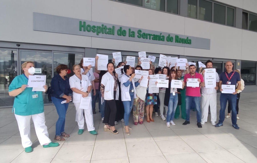 Los celadores del Hospital Comarcal de la Serranía de Ronda se han concentrado a las puertas del centro sanitario para pedir un aumento en la plantilla, una medida que llevan reclamando desde hace años, antes del traslado del personal al nuevo hospital.