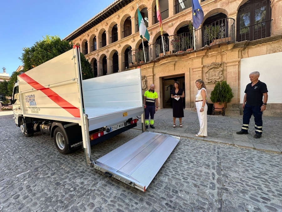 La alcaldesa de Ronda, María de la Paz Fernández y la delegada de Limpieza, María del Carmen Martínez, han presentado esta mañana un nuevo camión que la empresa Soliarsa utilizará para la recogida de enseres. Este vehículo facilitará la labor a los operarios, ya que cuenta con carga elevadora y sistema basculante.