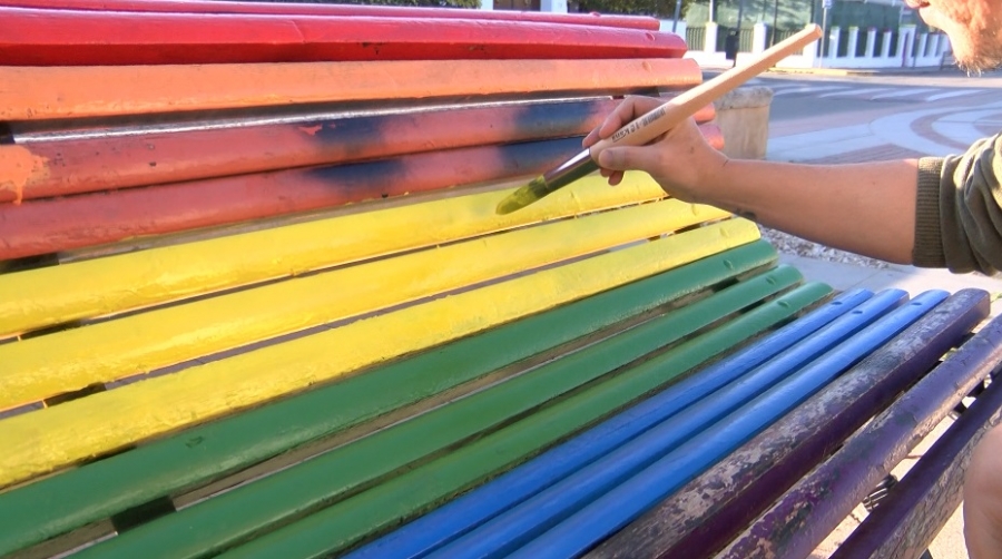 Un grupo de voluntarios de ARIS, la Asociación Rural e Inclusiva de la Serranía, ha restaurado en la tarde de hoy el banco arcoíris situado en la avenida Martínez Astein. Usuarios de este colectivo se han desplazado hasta este punto de la ciudad para volver a dar color al banco, que había sido vandalizado con pintadas hace varios días.