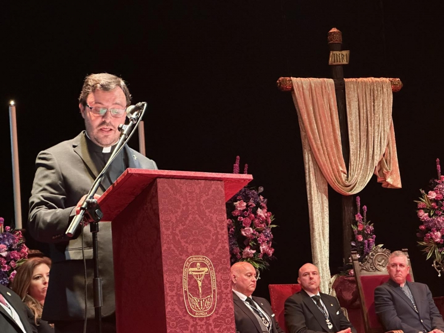 El Teatro Municipal Vicente Espinel acogió este domingo el Pregón Oficial de la Semana Santa de Ronda 2025. El encargado de anunciar con su palabra la llegada de los días más importantes del calendario cofrade fue el sacerdote Juan Carlos Millán Guerrero, muy querido en la ciudad por su vinculación pastoral y personal con numerosas hermandades y vecinos durante los ocho años que residió en nuestra ciudad.