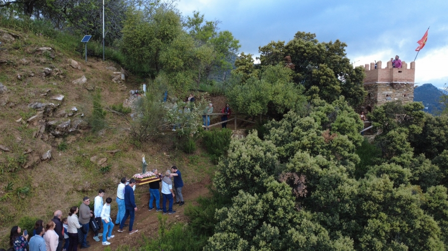Tras ello los adultos tomaron el relevo en el camino de ascenso, desde el que se observaban unas vistas impresionantes del Valle del Genal y de Benalauría a los pies del Cerro del Olivo. A lo largo de este sendero se sitúan cinco hitos que representan los cinco Misterios del Rosario. Tras colocar de nuevo a la Virgen en su altar del Torreón, la fiesta se prolongó con las actuaciones musicales de un grupo y un dj.